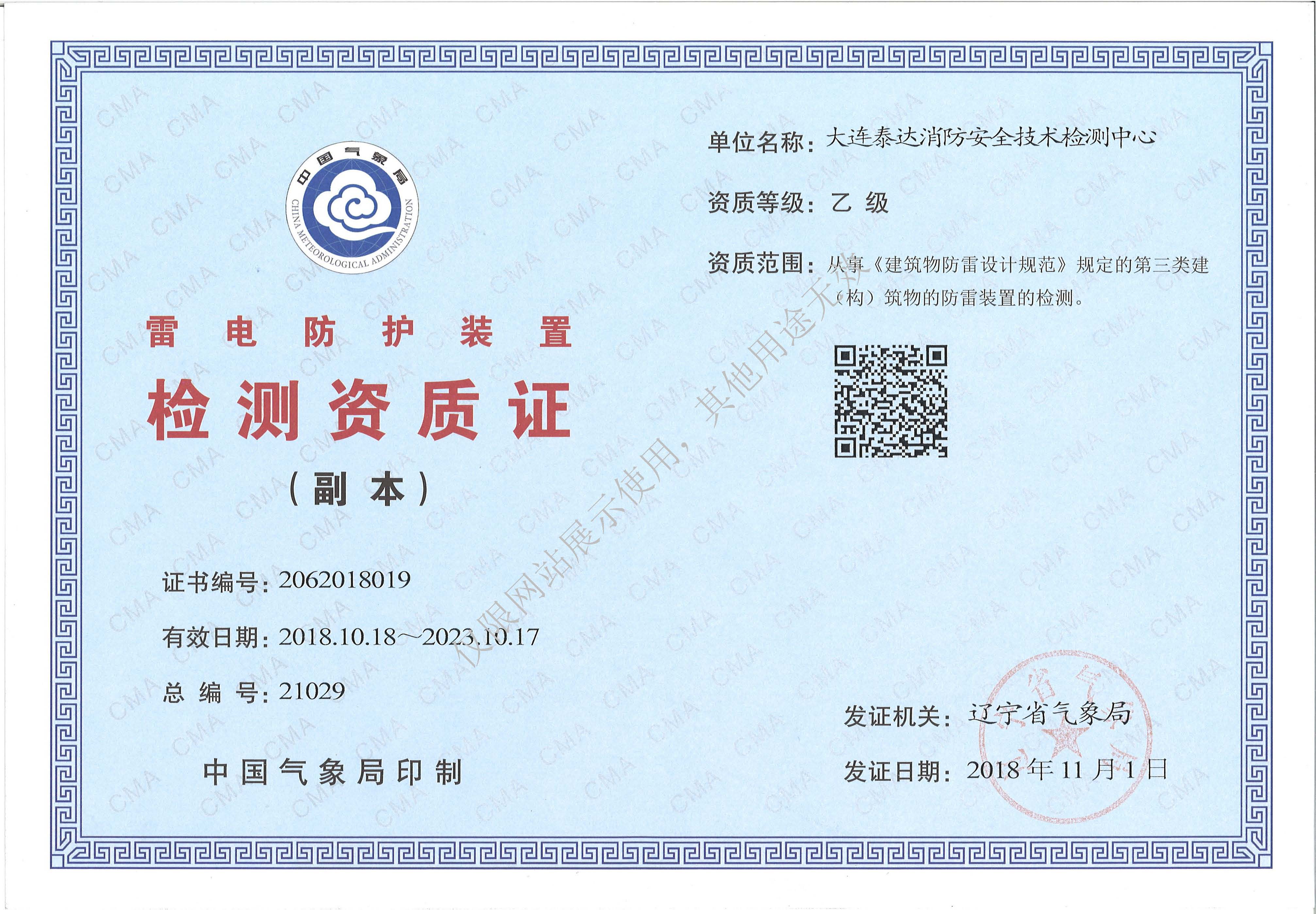 · 是經(jīng)“社會消防技術(shù)服務(wù)信息系統(tǒng)”備案并公示的消防技術(shù)服務(wù)機(jī)構(gòu),已取得中國氣象局頒發(fā)的雷電防護(hù)裝置檢測資質(zhì)證書、遼寧省質(zhì)量技術(shù)監(jiān)督局審核批準(zhǔn)的檢驗(yàn)檢測機(jī)構(gòu)資質(zhì)認(rèn)定證書(CMA)及包括消防檢測、電氣檢測、雷電防護(hù)裝置檢測、防火涂層厚度檢測等在內(nèi)的200余項(xiàng)檢驗(yàn)檢測能力,取得大連市應(yīng)急管理局頒發(fā)的安全生產(chǎn)標(biāo)準(zhǔn)化證書,獲得質(zhì)量管理體系、環(huán)境管理體系、職業(yè)健康安全管理體系認(rèn)證證書,是經(jīng)備案的高新技術(shù)企業(yè),可獨(dú)立出具具有證明作用的檢測報告。